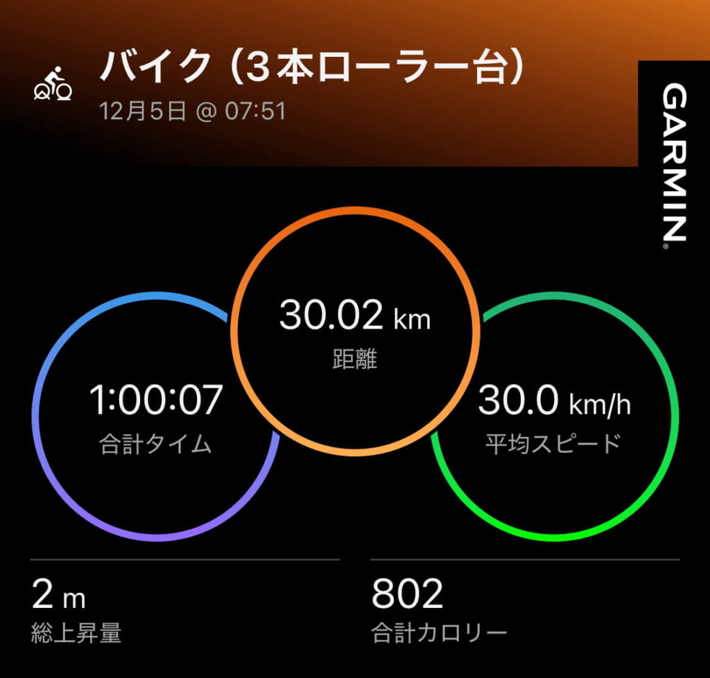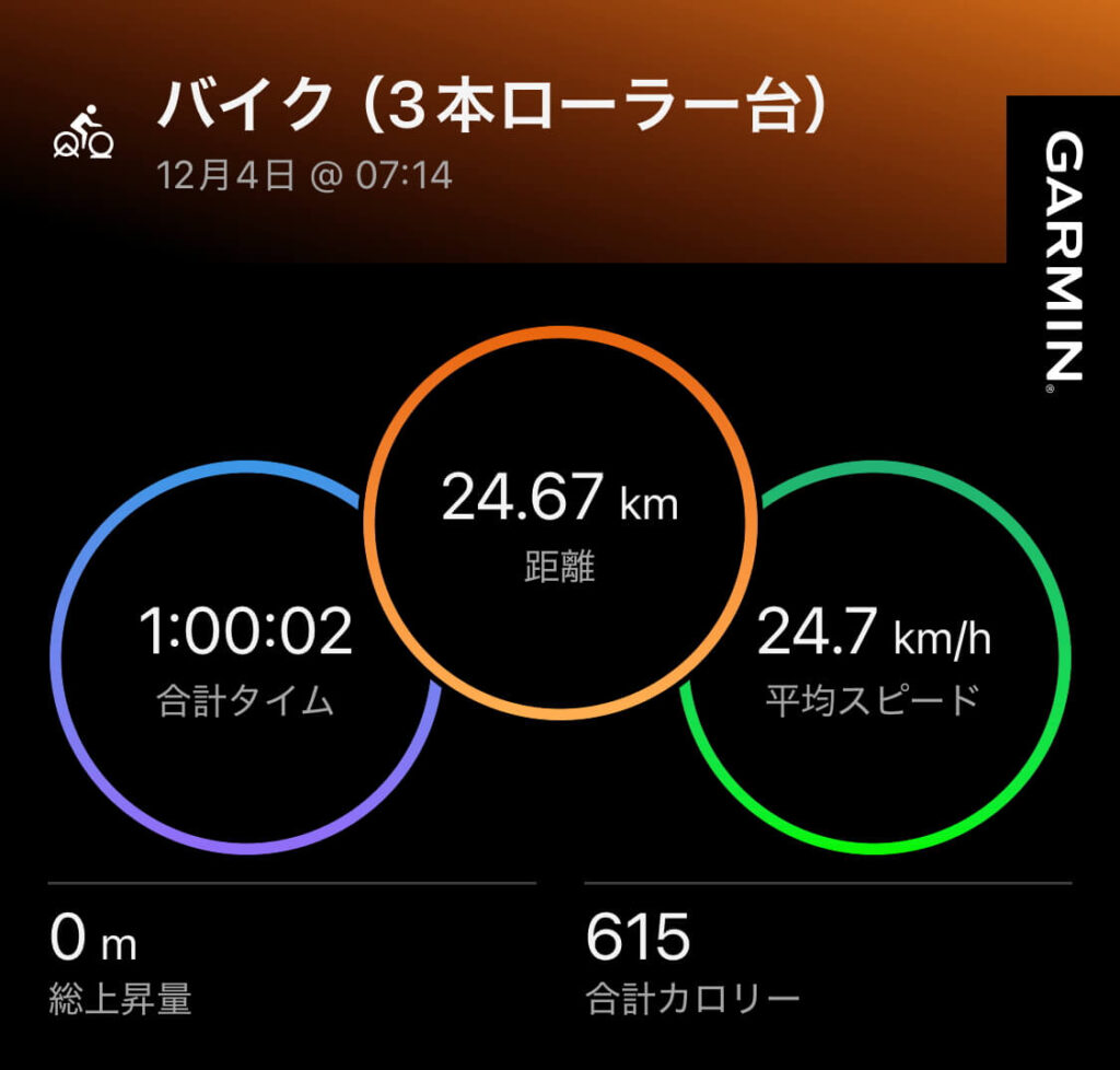 | 12/4(木) | バイク(3本ローラー台) | 24.67km | 久々に「痛みゼロ」で走れて感動。 |