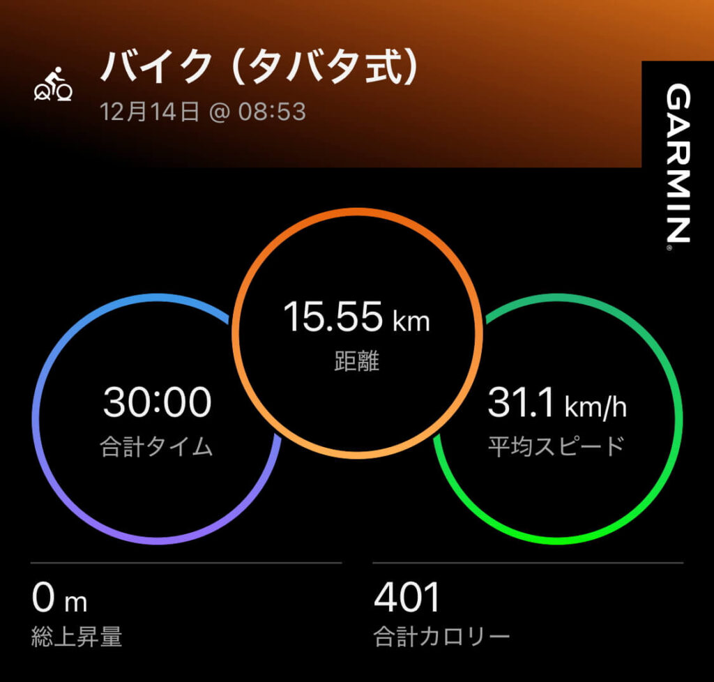 | 12/14(日) | バイク(タバタ式) | 15.55km | 勇気あるランオフ |