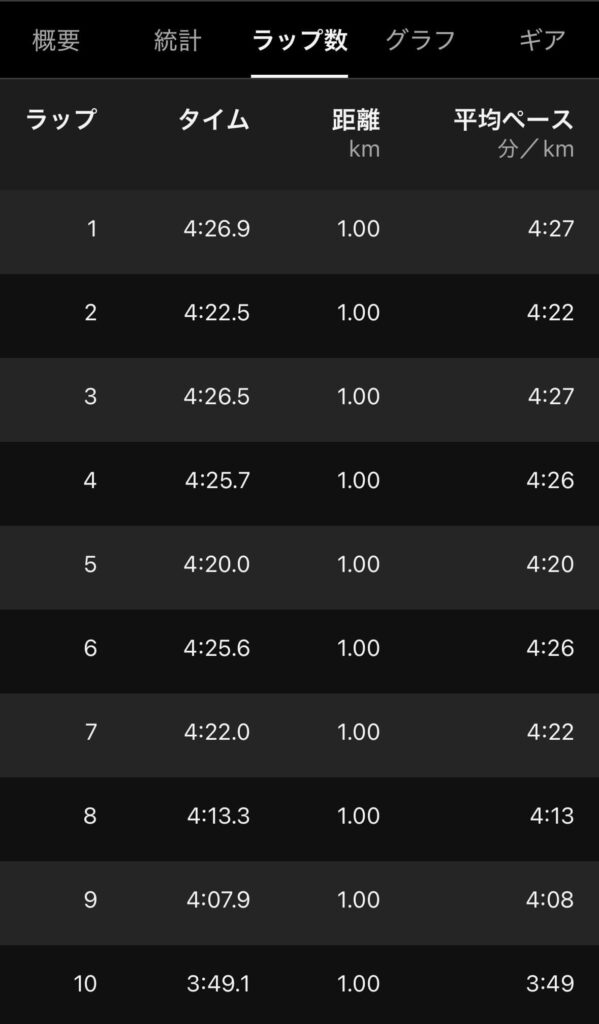 ラスト1kmは3’49/kmまで上げることができました。