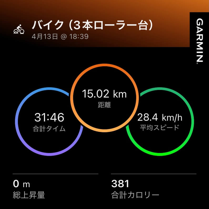 4/13(月) バイク(3本ローラー台)15km