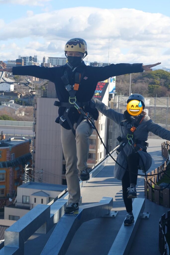 「Dive&Walk」は、中間展望台屋上(地上 26m)の外周部に、ハーネス(命綱)を装着しアスレチックを体験しながら一周する「W a l k」、タワー中間部(地上約40m)から約14m下の中間展望台を目掛けて飛び出す「Dive」の2部構成としています。EV棟から免震タワーへと渡る橋は、EV棟から支持して、免震タワーとは縁を切った構造としており、地震等の災害時でも安全に利用できる構造としています。お客様は、EV棟階段を上り最上階から免振型渡り橋を通りタワー塔へと進み、大阪を一望できる高さを感じながらアトラクションを堪能してもらいます。